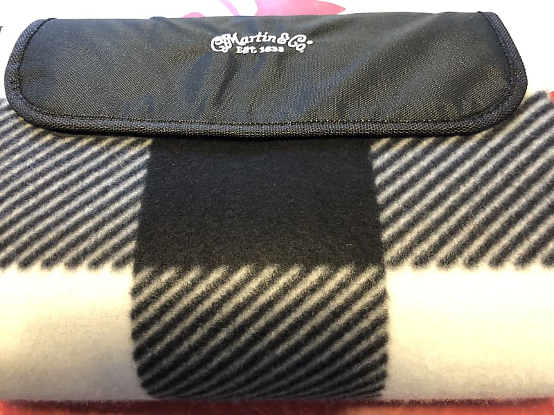 Black and White picnic blanket with C.F. Martin logo and carrying strap. One side is fleece and the other side is vinyl. Nice thing to have if you're going to be sitting on the ground somewhere, like going to an outdoor concert.