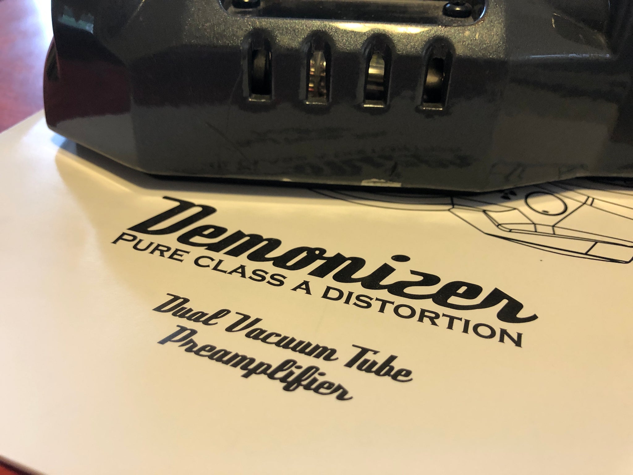 Damage Control Demonizer, dual vacuum tube preamplifier. Good used working condition. Has a small chip on the side which is shown in the second photo. Complete with AC Adaptor, box and manual.